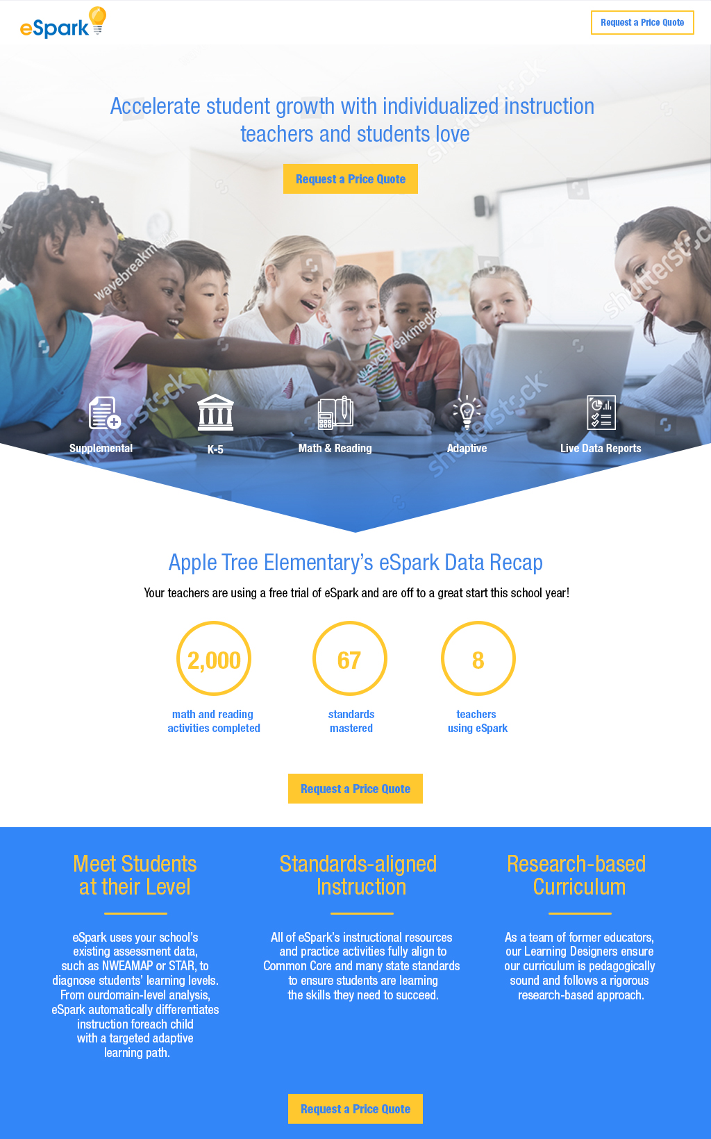 Concept landing page designs for eSpark Learning, which provides enhanced learning in Math and Reading with engaging activities for children in grades K-5. The goal of the landing pages is to act as a lead generation for the company to attract more clients while informing visitors of the benefits of using eSpark Learning.